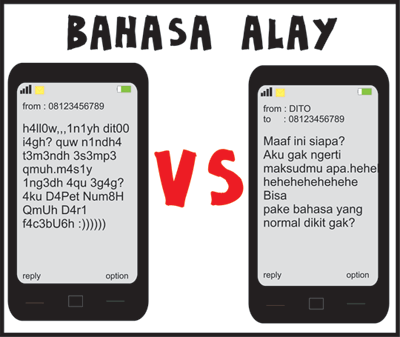 Duh itu mah alaynya kelewatan ya, aku nggak sampai begitu hehe, mungkin dulu cuma mengganti huruf i dengan tanda seru dan selalu ditambahin huruf c, misalnya, yach, dech, gituch aja gak terlalu alay! woiya, saya juga harus irit pulsa waktu pake handphone es*a dulu, karena pulsanya ituloh perkarakter, haha. Gimana? pernah begini kan? ya pasti pernah lah.